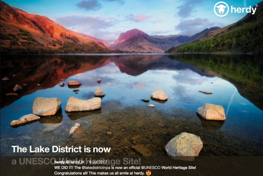 During the Lake District's World Heritage Bid, a wide variety of users, from organisations directly involved in the bid to local individuals and businesses, made use of images of the Lake District on Social Media. Social media has been utilised as an effective means to disseminate evocative and impressive images of the Lake District, both to develop a specific narrative and imagination of the Lake District as an awe-inspiring yet accessible place, and to distribute important announcements throughout the campaign.